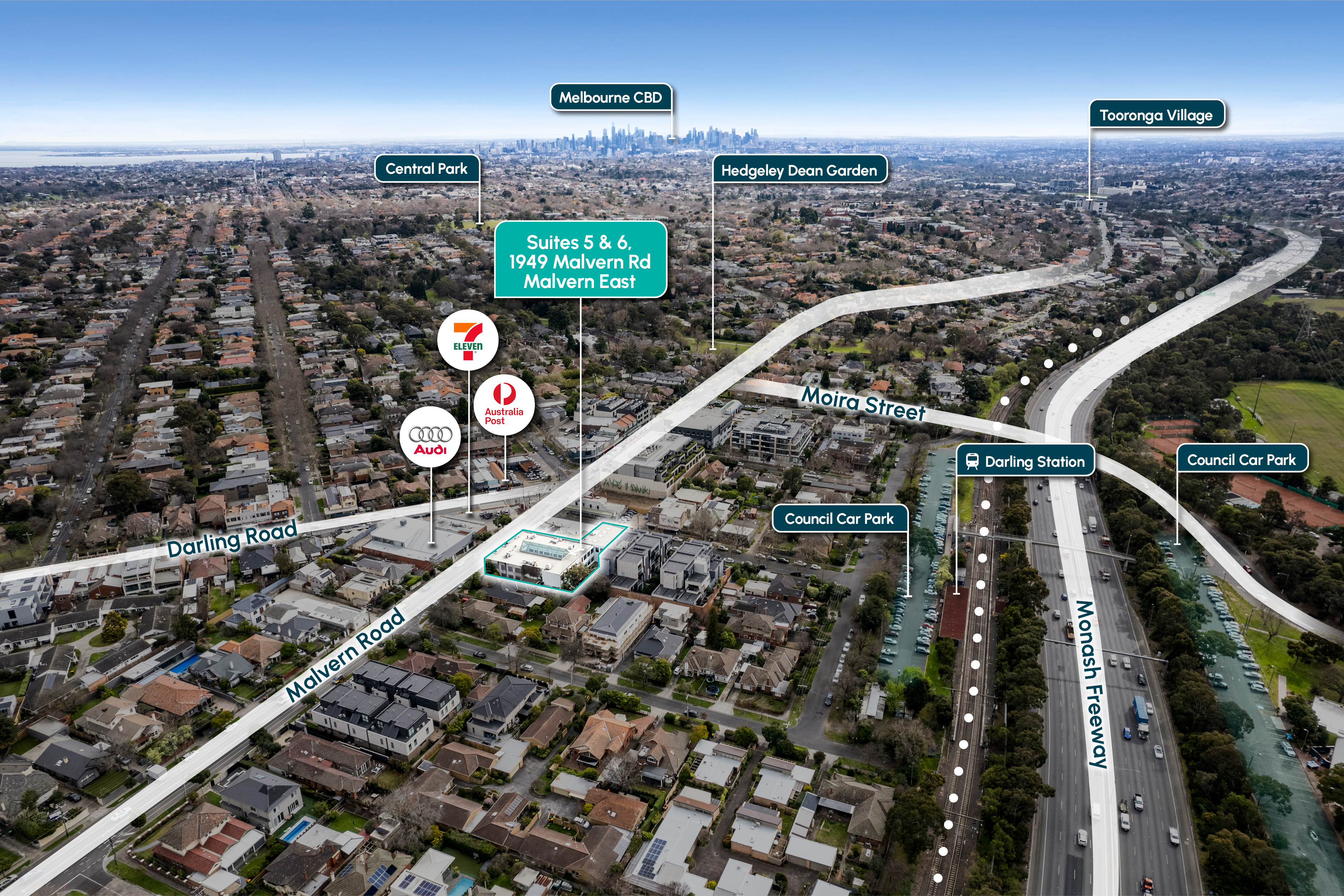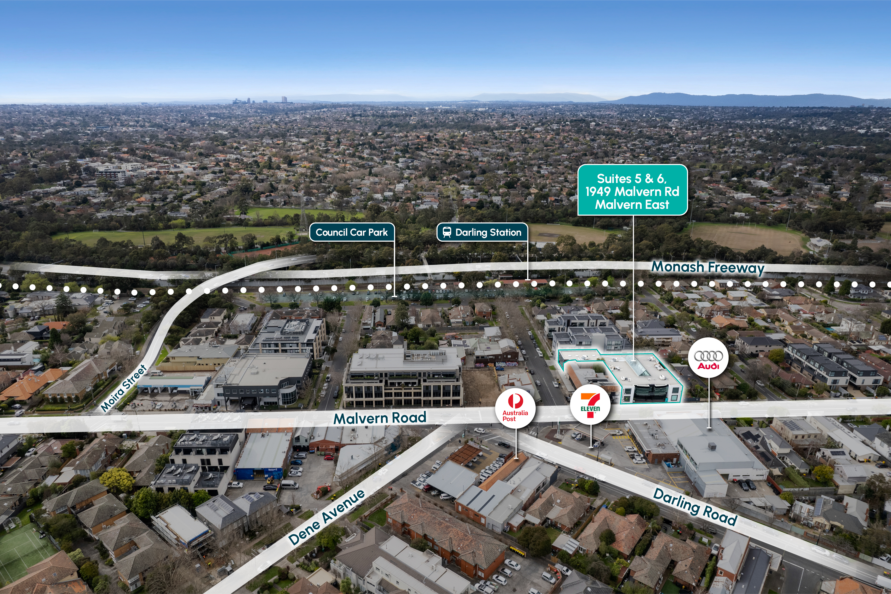 This modern office complex is located on Malvern Road near the intersection of Darling Road and only a two minute walk to Darling Train Station with the South Eastern Freeway entry/exit only a short drive away. Cafes and lunch eateries are in close proximity.
